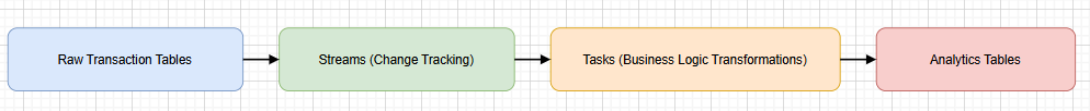 - Streams: Monitor real-time changes in transaction and inventory tables for immediate business response